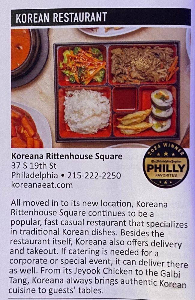 Located in the heart of Philadelphia, Koreana Rittenhouse Square offers a delightful journey into Korean cuisine. The menu features an enticing array of dishes, with standout options such as the Sweet and Sour Tofu and LA Galbi, each artfully presented on hot plates for an invigorating dining experience. Guests can savor the convenience of lunch bento boxes, which include a balanced assortment of flavors alongside comforting sides like japchae and miso soup.